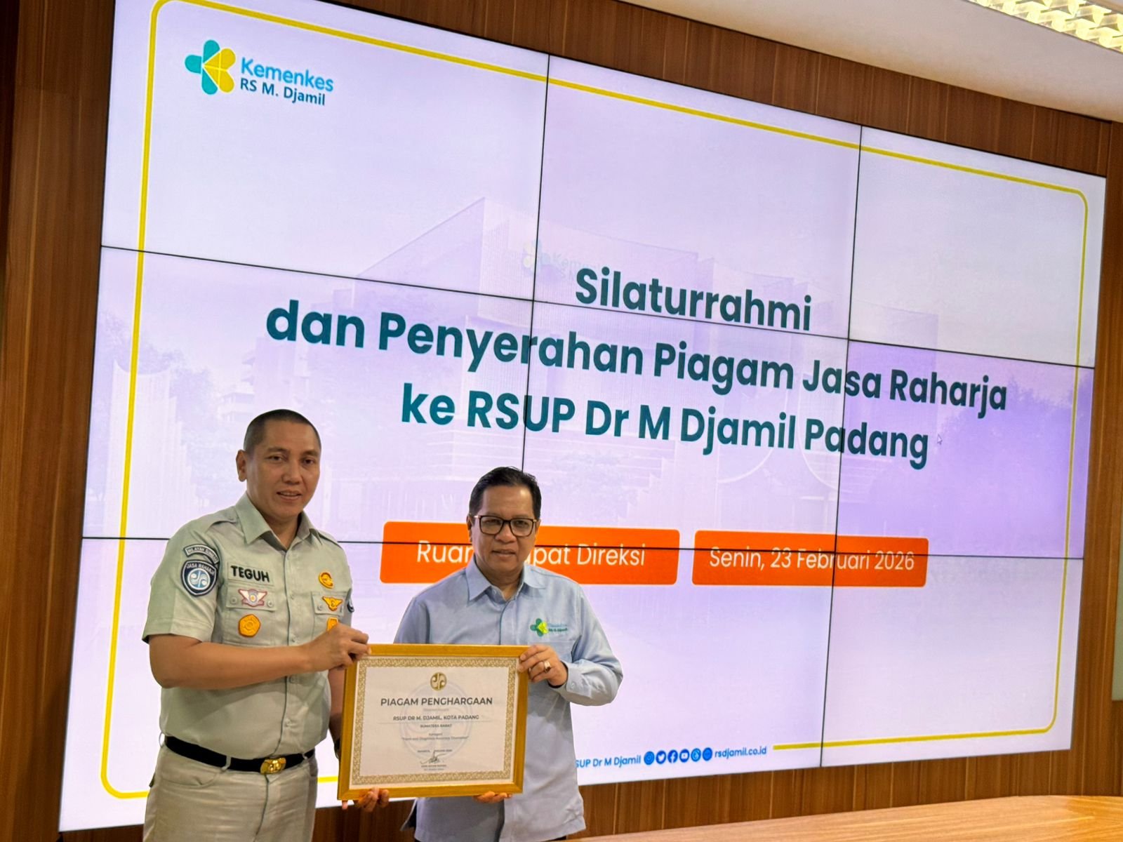 Padang – PT Jasa Raharja Kantor Wilayah Sumatera Barat melaksanakan kegiatan silaturahmi sekaligus penyerahan piagam penghargaan kepada RSUP Dr. M. Djamil Padang, Senin (23/2). Piagam penghargaan tersebut diserahkan langsung oleh Kepala Kantor Wilayah PT Jasa Raharja Sumatera Barat sebagai bentuk apresiasi atas komitmen rumah sakit dalam memberikan pelayanan terbaik kepada korban kecelakaan lalu lintas.