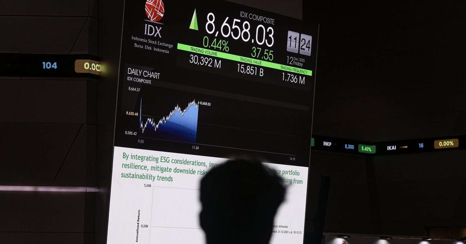 Dari sisi aktivitas perdagangan, total volume saham yang diperdagangkan mencapai 19,739 miliar saham dengan nilai transaksi sebesar Rp17,909 triliun. Kapitalisasi pasar tercatat sebesar Rp16.022 triliun dengan frekuensi transaksi mencapai 557.698 kali.
