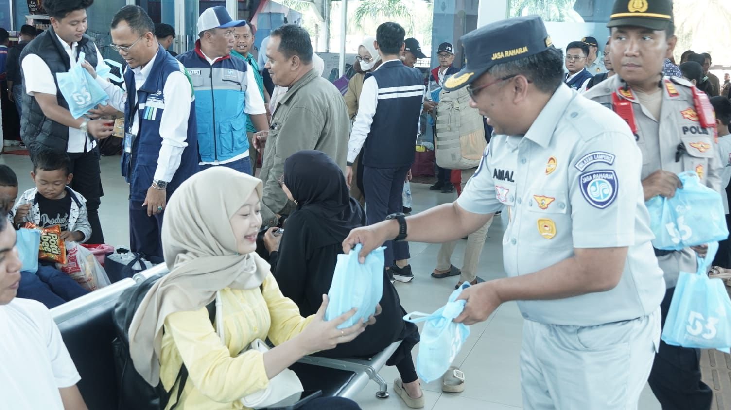 Dalam kegiatan tersebut, dilakukan pembagian bingkisan kepada para pemudik sebagai bentuk kepedulian dan apresiasi kepada masyarakat yang tengah melakukan perjalanan arus balik Lebaran. Aksi simpatik ini juga menjadi bagian dari upaya bersama dalam menciptakan suasana perjalanan yang aman, nyaman, dan penuh kebersamaan.
